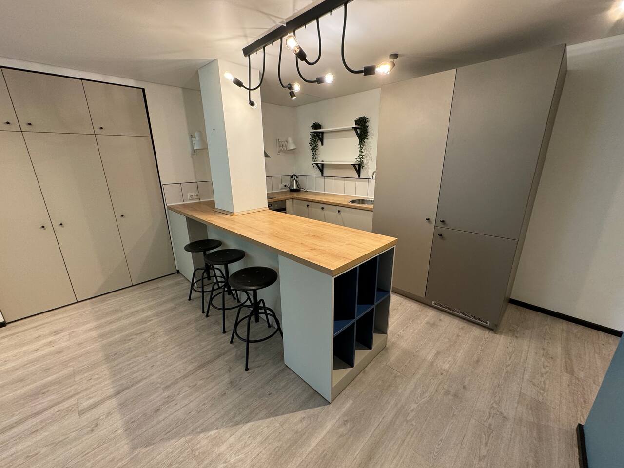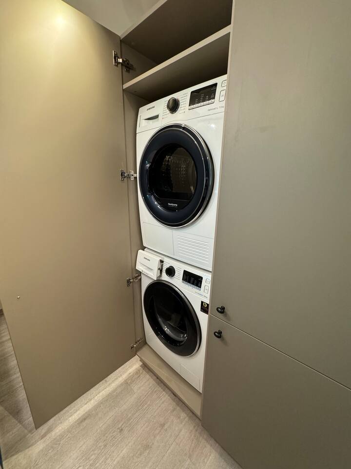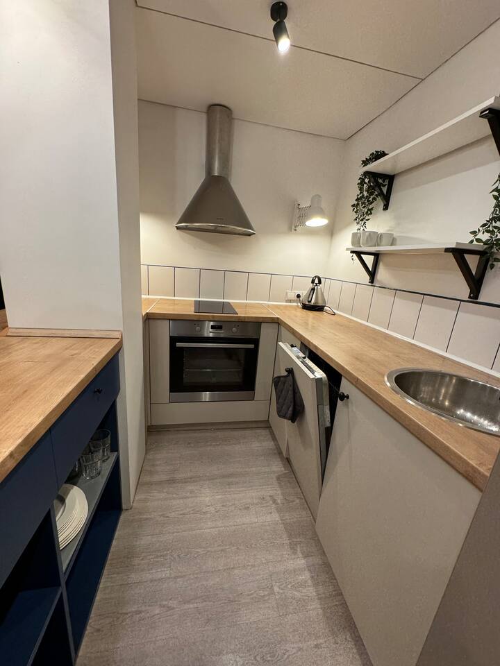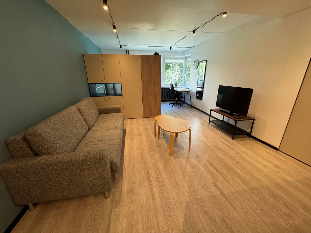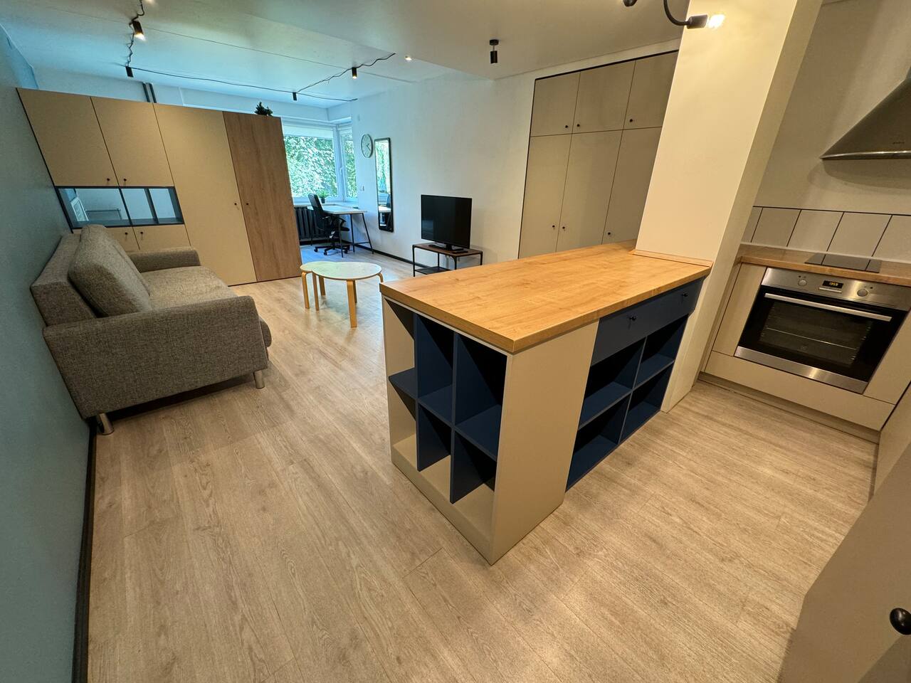 You enter apartment via main building entrance and heading straight, as it is located on the first floor. Near the entrance you'll find wall to hang your coats. The combined living and sleeping area features a comfortable 140 cm double bed with a full-size mattress, separated by a bookshelf and drawer. The living room has a convertible sofa bed, also 140 cm wide, and a wall-mounted TV with Google TV for Netflix, YouTube, and other apps. A dedicated workspace is available for guests needing to work remotely. Kitchen area is fully equipped with an induction stove, oven, fridge, freezer, dishwasher, and a full set of cookware and dishes for up to four guests. There is as well a bar table with three stools. The kitchen area also includes a drawer with a washing machine and tumble dryer. Vacuum cleaner is placed on one of the walls. Perfect for individuals, couples or families seeking peace, quiet, comfort and convenience during the stay.
