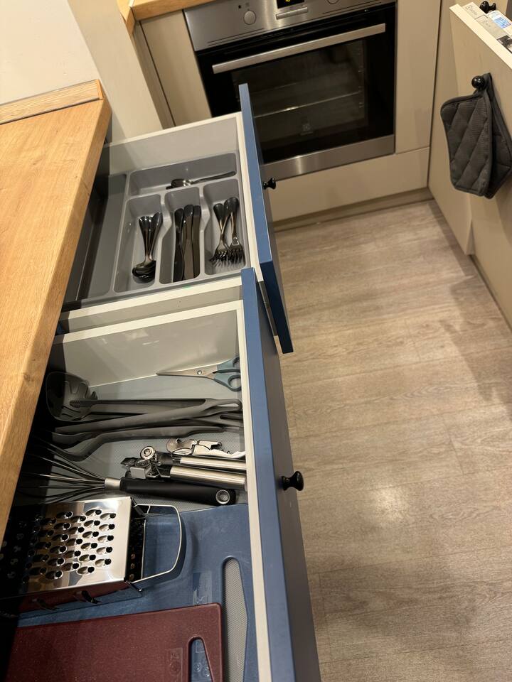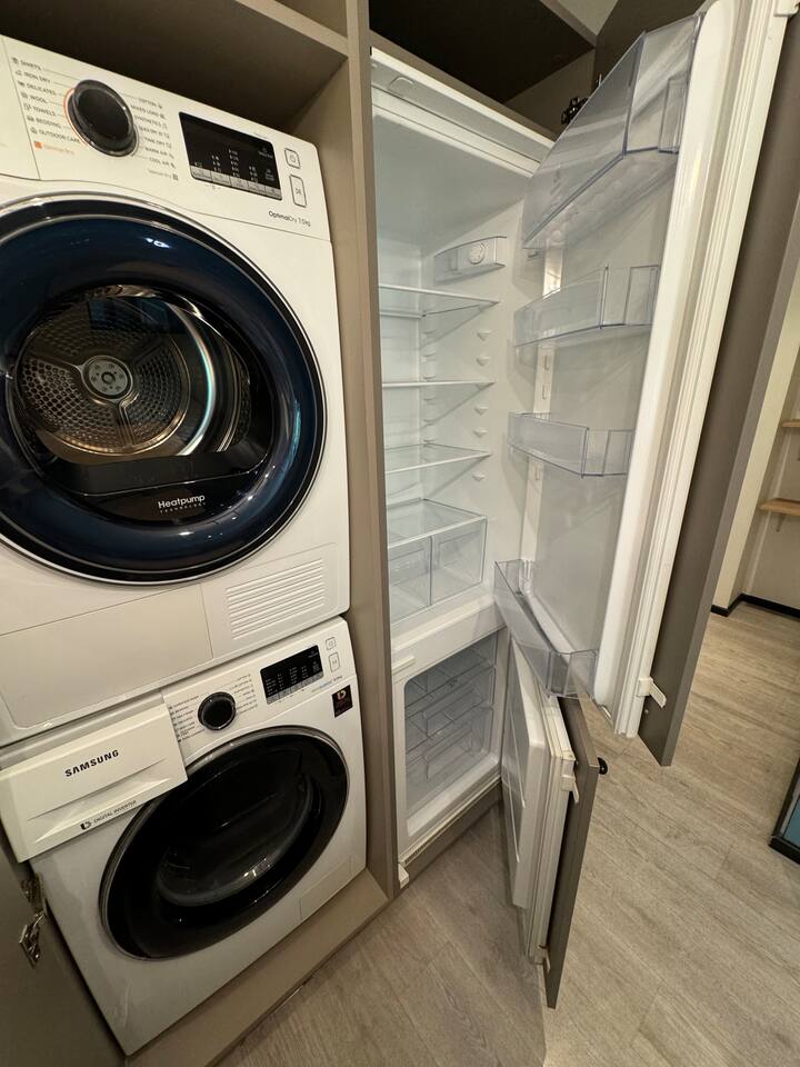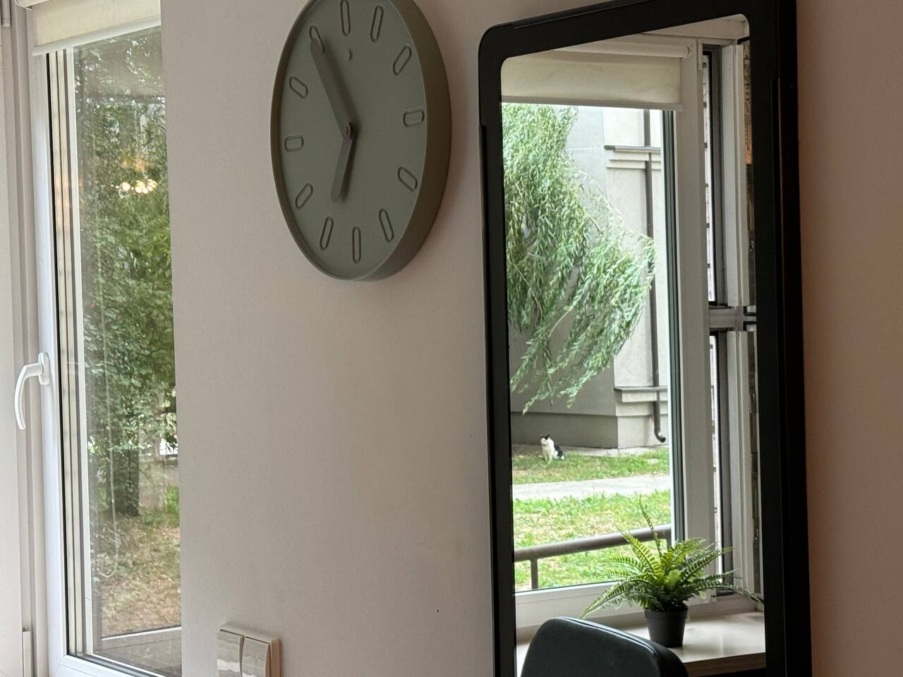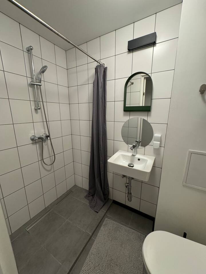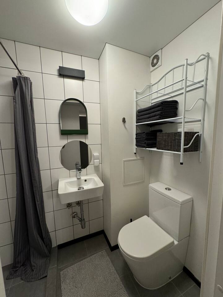 You enter apartment via main building entrance and heading straight, as it is located on the first floor. Near the entrance you'll find wall to hang your coats. The combined living and sleeping area features a comfortable 140 cm double bed with a full-size mattress, separated by a bookshelf and drawer. The living room has a convertible sofa bed, also 140 cm wide, and a wall-mounted TV with Google TV for Netflix, YouTube, and other apps. A dedicated workspace is available for guests needing to work remotely. Kitchen area is fully equipped with an induction stove, oven, fridge, freezer, dishwasher, and a full set of cookware and dishes for up to four guests. There is as well a bar table with three stools. The kitchen area also includes a drawer with a washing machine and tumble dryer. Vacuum cleaner is placed on one of the walls. Perfect for individuals, couples or families seeking peace, quiet, comfort and convenience during the stay.